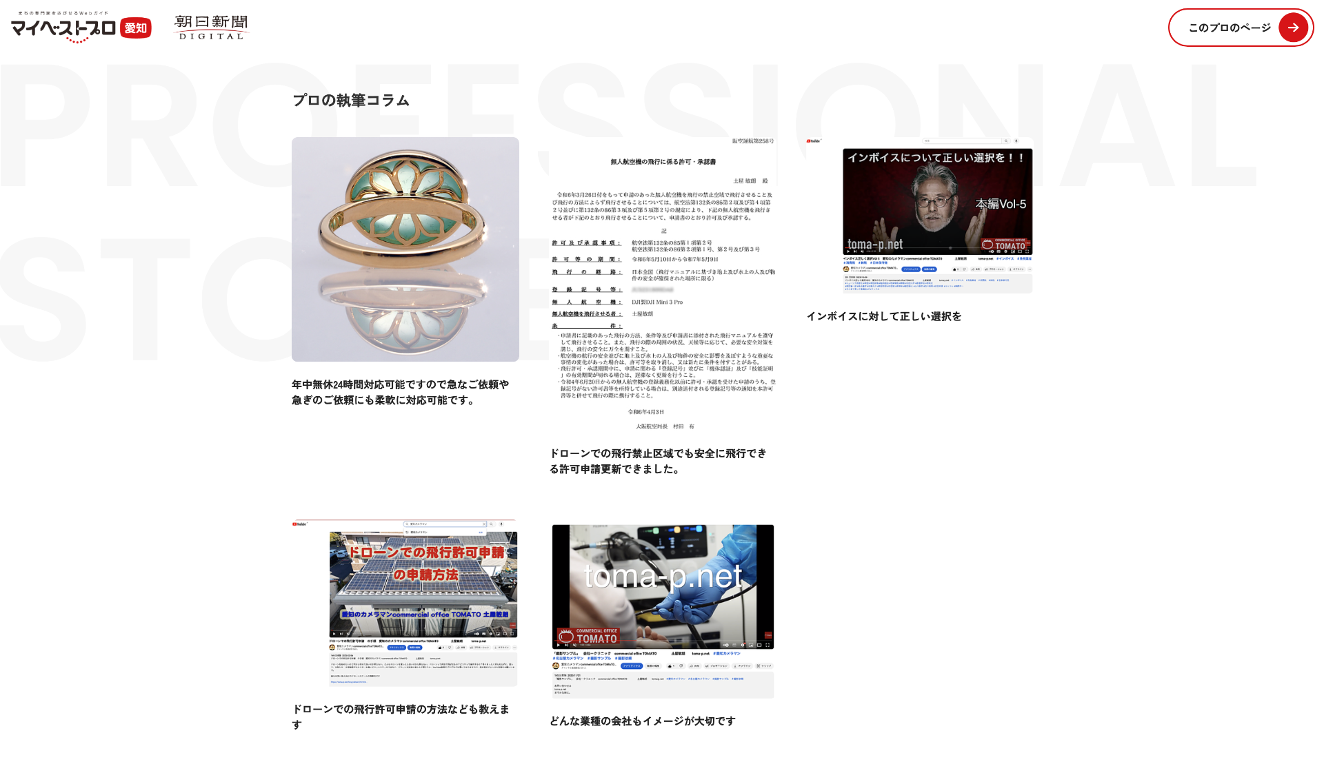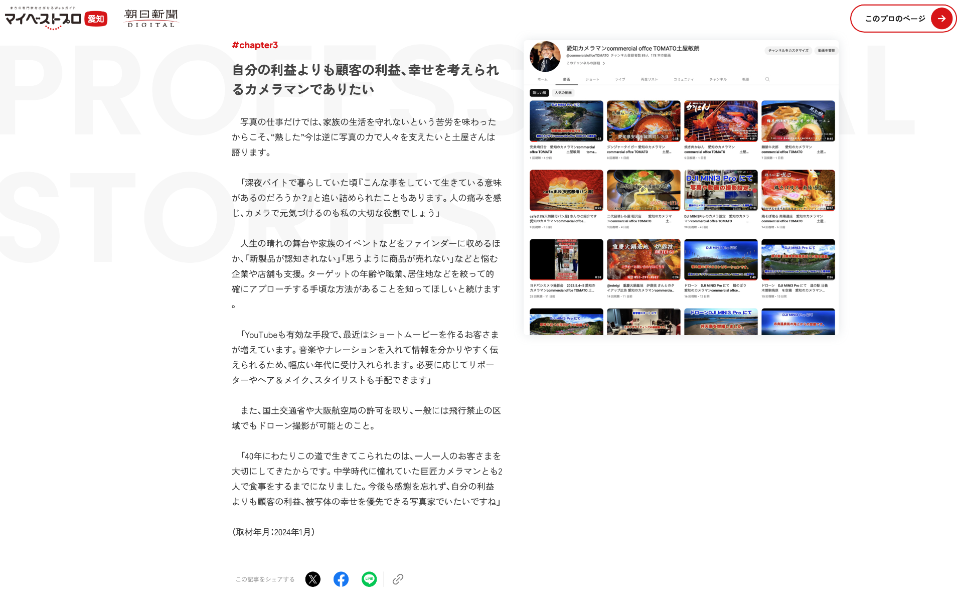 「デジタルの普及で誰でも簡単に写真が撮れるようになり、自称プロカメラマンが増えましたが『言われたことしかやらない、また要望された事もまともにやれない』という評価も多いようです。対して私は、顧客の利益や知名度の追求に専念しているためアイデアが尽きず、効果的な宣伝方法を的確にアドバイスできます」