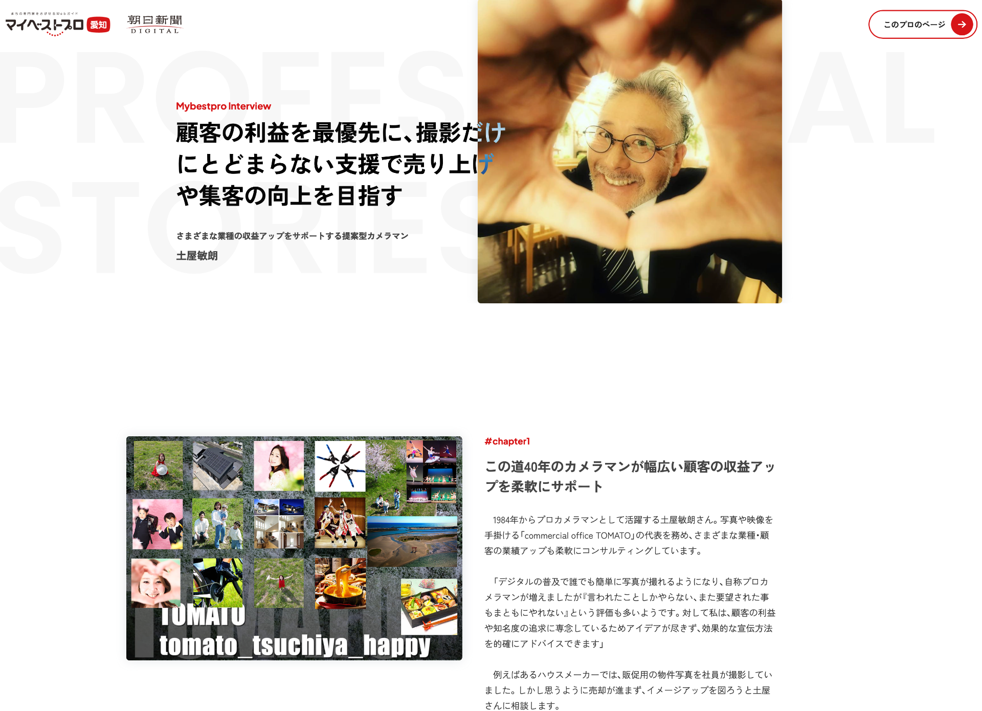 取材ページ←こちらをクリックして下さい。1984年からプロカメラマンとして活躍する土屋敏朗さん。写真や映像を手掛ける「commercialofficeTOMATO」の代表を務め、さまざまな業種・顧客の業績アップも柔軟…